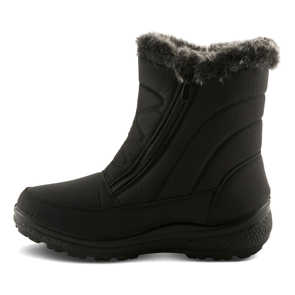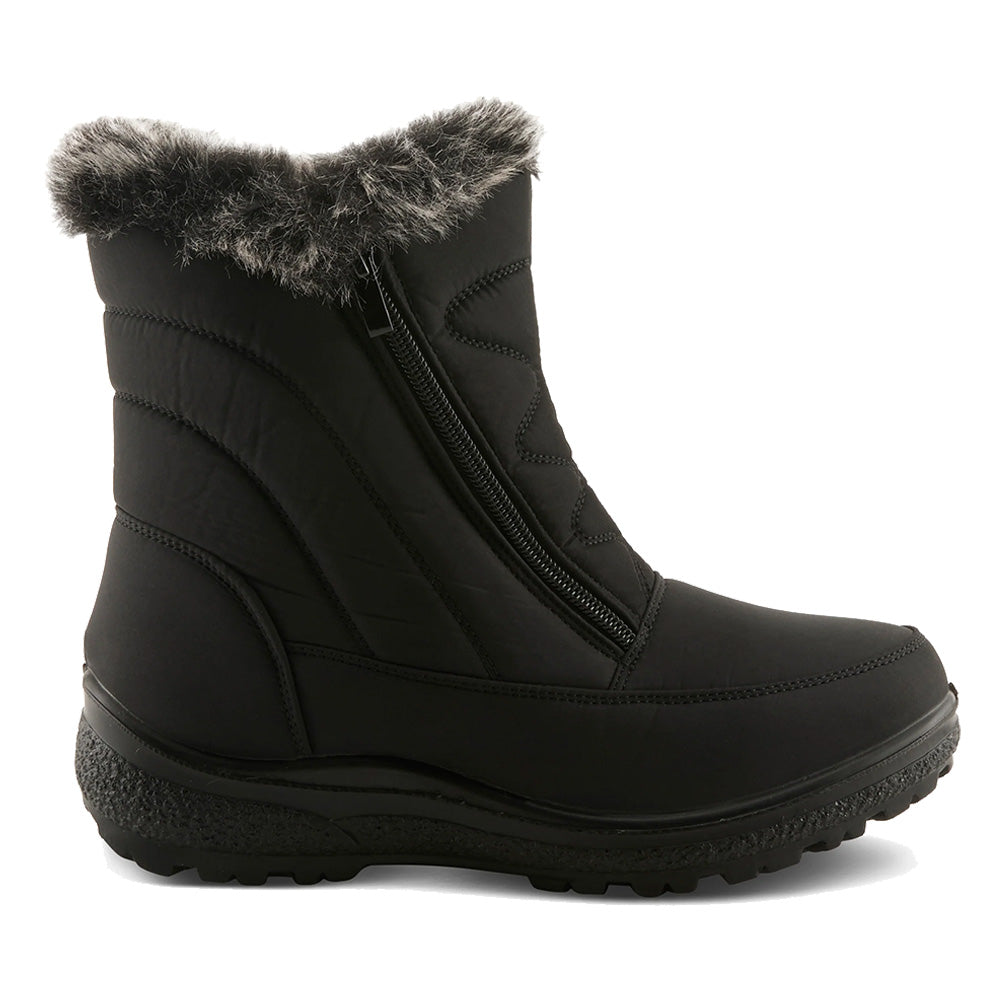 Cozy and comfortable waterproof nylon booty, beautiful faux fur collar and shaft stitching detail with fashionable dual zippers, very flexible construction with direct injected light weight two color polyurethane outsole.